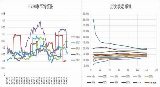 根据豆粕期货历史波动率的季节性特征,豆粕期货波动率在9月进入下行通道,趋势一般延续至10月中下旬,对比分析可得,今年豆粕期货的历史波动率走势与2015年的相关性最强,而2015年的历史波动率的下行趋势至11月下旬才会结束,在标的期货未来走势震荡为主的行情下,历史波动率将大概率延续弱势。当前的30日、60日、90日、120日历史波动率分别为13.92%、14.01%、15.15%、16.28%,分别位于近三年的24.83%、13.09%、11.73%、15.55%分位水平,整体来看,短期历史波动率略低于中长期历史波动率,有向上回归需求。综合来看,当前的隐含波动率小幅低于历史波动率,且处于历史偏低水平,未来走势不明确,需要后市的重大消息及市场情绪指引。