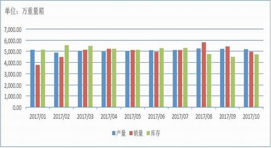 图7:2017年1-10月年中国浮法玻璃产销存统计图(单位:万重量箱)