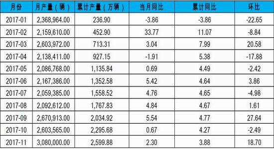 3、2017年1-11月全国汽车产量数据