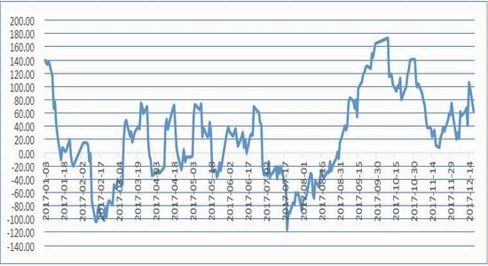 从图4中可以看出,2017年玻璃期现基差大部分时间都为正值,表明玻璃期货贴水贯穿全年大部分时间。基差在-120-170元的范围内震荡,而主要震荡区间是在-60-80元之间。根据基差走势图可以作为操作玻璃期货时的参考,当玻璃期现基差小于-60的时候,正向套利机会出现;当玻璃期现基差大于80的时候,反向套利机会出现。