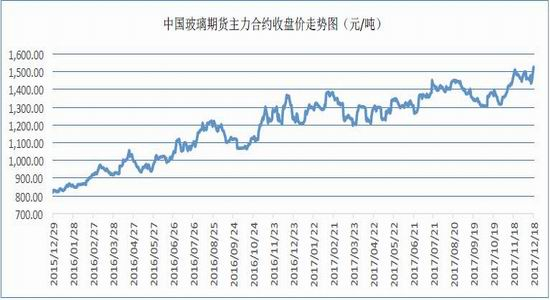2017年平板玻璃市场走势好于预期,全年玻璃主力期价涨幅为22.8%,运行重心较2016年大幅提升。年初在原料价格上涨的拉动下,玻璃期价从1200附近低位开始逐步反弹,并于2月中旬创下1430的高位,不过随着春节后厂家库存增加及纯碱价格高位回落,玻璃期价重心也开始下滑。进入二季度之后,现货库存消化顺畅,市场利润走好,玻璃价格波动区间收窄至1200-1300附近。7-8月,传统旺季效应逐步体现,成本推涨和传统旺季的共振下,期价波动重心一举拉升至1450元/吨左右,虽然真正到了金九月市场价格出现回调,但三季度整体波动区间高于上半年。而四季度环保政策收紧,沙河市场多条生产线限产加停产,玻璃前所未有的供给侧收缩拉动,令这波玻璃价格实现暖冬行情,12月初,玻璃期价创下了近4年多以来的高位。