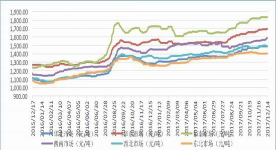 从图5中可以看出,2017年玻璃现货市场价格呈现持续平缓上涨的走势,各区域年初到年底的价格涨幅在100-200元之间。其中华北市场涨幅最大,2017年全年价格上涨200元左右,涨幅约24%;华南市场涨幅最小,全年价格上涨110元左右,涨幅约6%。