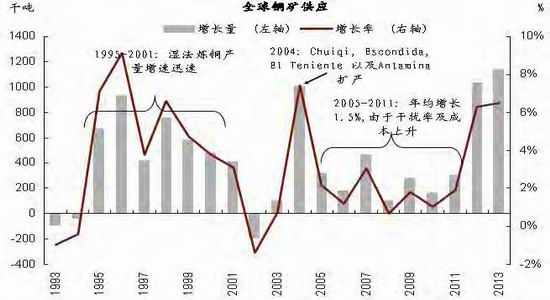 而2012年全球铜矿山资本支出达到顶峰之后,以5年为一个周期,这意味着2017年缺乏大型矿山投产,直到2020年全球铜矿产出增速会出现回落。因此,在基于铜价反弹驱动原先推迟或者停止的项目恢复,从重启到投产需要一定的时间来变现成实际供应。