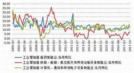 从工业增加值来看,2017年11月份,装备制造业增加值同比增长10.3%,增速高于全部规模以上工业4.2个百分点,继续保持在两位数以上。其中,计算机、通信和其他电子设备制造业、仪器仪表制造业、电气机械和器材制造业分别增长15%、10.6%和10.5%。