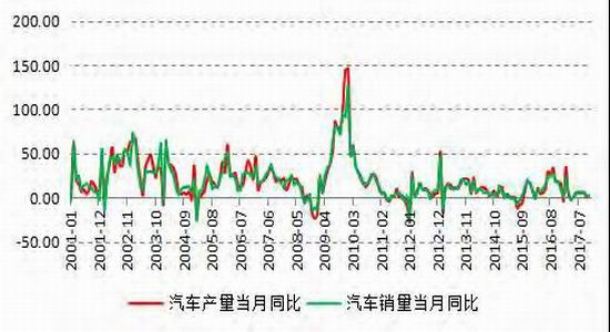 汽车方面,在新能源汽车产销大幅增长的情况下,汽车总产销增速出现明显的回落。中汽协数据显示,2017年11月中国汽车产量同比增速仅为2.3%,而2016年同期高达17.8%,三季度还保持5%以上的增长;与此同时汽车效率在11月同比回落至0.7%,2016年同期高达16.7%。