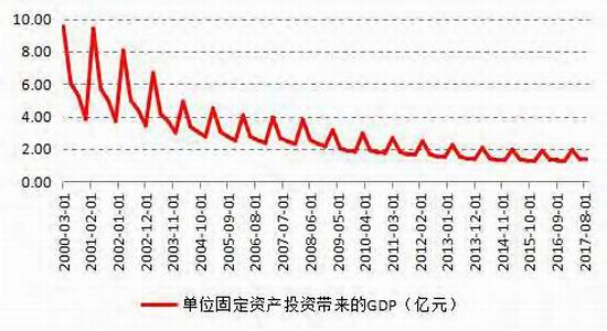 衡量资本效率的另一指标是边际资本生产率(MarginalCapitalProduction,缩写为MCP),它被定义为一个单位资本存量增量可以带动多少单位的GDP产出变化,边际资本生产率实际上数值越大则说明投资效率越高。统计发现,截止2017年前三季度,单位固定资产投资带来的GDP为1.29亿元,而2003年前三季度高达5.28亿元。