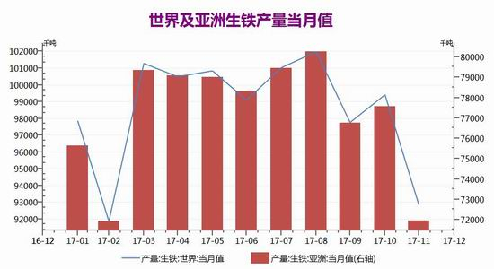 数据显示,2017年1-10月份全球生铁产量99160万吨,同比增长1.2%,同时10月份全球生铁产量9964万吨,同比增长1.3%,预计11月全球生铁产量在我国采暖季环保限产的带动下显著下降,但在全球经济持续复苏,亚洲产区稳中有增的背景下,2018年生铁产量或将小幅上升。
