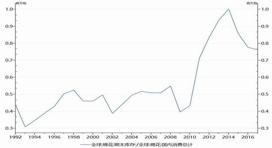 从USDA的11月份报告可以看出,2017/18年度棉花产量比上一年度增加326万吨至2644万吨,消费量增加110万吨至2596.4万吨,产销缺口为过剩47.6万吨,全球的棉花进出口数据近2年增幅非常有限,出口量为828.1万吨。2、全球的棉花库存消费比全球棉花库存消费比与棉花价格高度负相关:库存消费比越高,表明棉花库存越充足,棉花价格就越低;反之,库存消费比越低,棉花价格就越高。