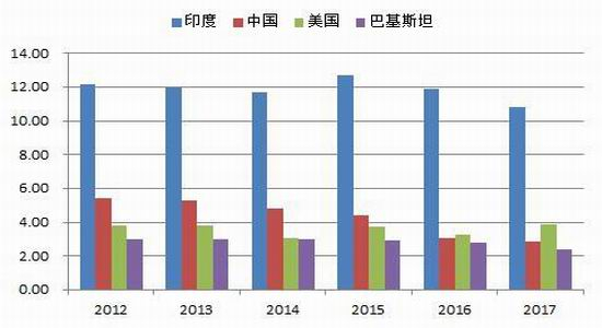 印度棉花产量也是连续2年回升,在2017/18年度因种植面积大增10%以上,产量也提升巨大。根据USDA的11月份报告可以看出,印度在2017/18年度产量增长65万吨至653.2万吨,产量已经是历史以来的第二高,仅次于2013年3100万包。由于印度的纺织业需求增幅较小,导致期末库存增加至历史最高点,达到了318.5万吨,库存消费比创下历史新高59.71%。从这些数据来看,印度将会增加对外出口棉花,和2016年相比国内供给非常充足。