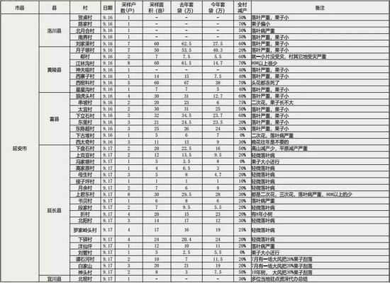 ●陕西省地区预计减产:延安地区产量350万吨,渭南地区产量300万吨,咸阳地区产量250万吨,其他地区产量300万吨,延安地区套袋数量减少55%,渭南地区套袋数量减少55%,咸阳地区套袋数量减少65%,其他地区套袋数量减少50%。由于套袋数的减少,减产670万吨左右。所余之果由于霜冻和落叶病的影响,果子非常小,重量保守估计下降8%.,综合得出陕西地区减产64%左右。
