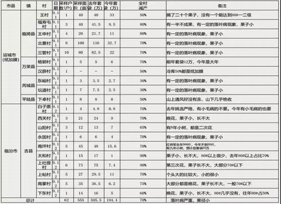 ●山西地区预计减产:山西省的优质主产区分两部分第一部分运城芮城地区。此地区套袋数量减少60%(芮城种植面积偏小),第二部分吉县的高山果园,套袋数量减产70%。结合后期的落叶病和霜冻导致的个头偏小。所以此地区我综合判断减产在65%左右。产量减少等于450万吨*65%=292.5万吨