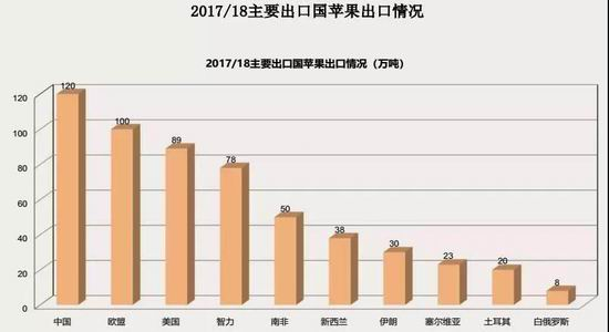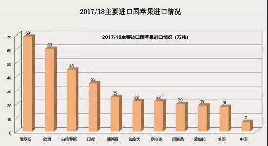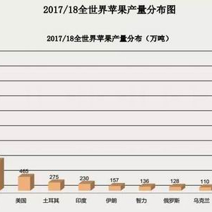 2017 年全世界苹果产量为 7621 万吨,主要产区是中国、欧盟、美国、土耳其和印度。自 2012 年以 来,世界范围内苹果产量总体呈上升态势,除 2017 年由于气候原因,欧洲地区产量下降 200 万吨。世界生产苹果的国家有 80 多个,年产量超过或接近 100 万吨的主产国有 12 个,按产量排,依次为中国(57%)、美国(9%)、土耳其(6%)、意大利(5%)、法国(5%)、波兰(5%)、德国(3%)、俄罗斯(3%)等。不包括中国,元帅系和金冠是世界两大主栽品种;若包括中国在内,富士则成为世界第一大栽培品种。美国、意大利、法国、智利、南非等新发展的果园中红富士占 50%以上,中国富士栽培面积占苹果总面积的 49.6%。2017 年全世界鲜果消费量为 6458 万吨,深加工消费量 1125 万吨。在欧洲大部分地区,约有 30%的苹果用来制作苹果酒和白兰地;用来制苹果酒的苹果占世界产量的 1/4。我国是世界上最大的苹果消费国,消费量占世界的一半以上;我国人均年消费量为 30 公斤,超过美国、欧盟等发达国家。鲜果消费占我国苹果总消费量的 90%左右,且保持稳步增长的态势;余下的深加工消费量则占到 10%左右,主要产品为果脯、苹果脆片、苹果醋和苹果酒等。USDA资料显示,2017 年全世界范围内主要的苹果进口国包括俄罗斯、欧盟、白俄罗斯、印度墨西哥等九个国家和地区,主要的出口国则为中国、欧盟、美国、智利、南非等九个国家和地区。我国苹果进口量历来较少而出口量较多,2016 年以来我国连续两年成为世界上最大的苹果出口国。我国鲜苹果出口远大于进口,常年保持贸易顺差,且出口主要集中在以孟加拉国和泰国为代表的亚洲国家。