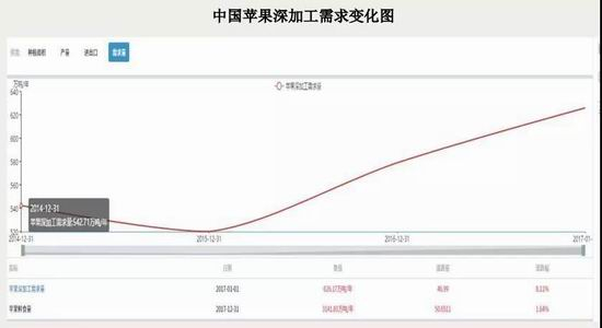 从苹果深加工需求变化图来看,我国苹果深加工消费量持续增长,但由于基数依然较小,且苹果深加工多用落果为原料,因此,深加工短期内对市场价格影响力度较弱。