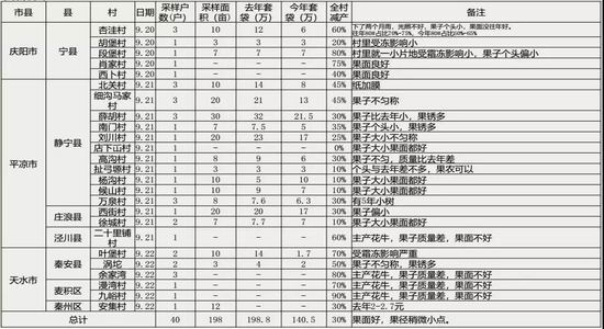 ●甘肃省东南部地区受灾原因以及特点:泾川宁县地区地形类似于陕西的北部山区,也是高原之上的平原,受灾很严重。静宁秦安,则是种植于山沟中的平原洼地地带,冷空气沉积,受灾严重。此地区静宁一带果树是高山梯田,则减产较轻。甘肃地区落叶病少见。