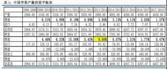 由供需平衡表得知,产量增速由2013年开始进入增速平台期在3%左右,到2017年下降至1.37%。供大于求的数量大概在100万吨左右并且无论增产多少,苹果都可以在价格的调节下进行彻底消化。今年减产43%,产量下降2000万吨,难道还存在累计中的供过于求?