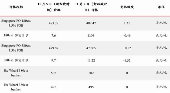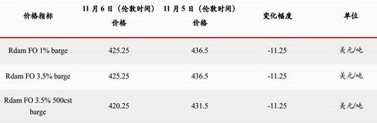2.舟山保税燃油市场:11月5日舟山IFO380cst参考价格为500.5美元/吨,较前日持平;MGO参考价格842.5美元/吨,较前日持平。(数据来源:www.zsbunker.cn)