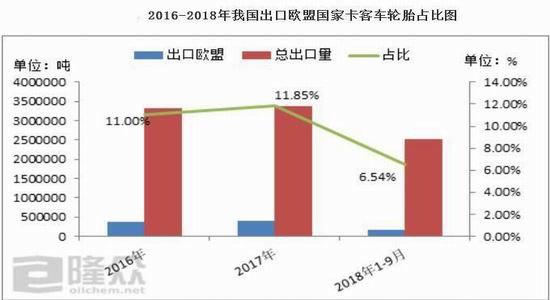 从近几年国内卡客车轮胎整体出口形势来看,2016-2018年中国出口卡客车轮胎总量变化不大。2017年内欧盟开始宣称对华卡客车轮胎进行反倾销调查,轮胎厂家以及欧盟进口商为了在确认税率前提前确定订单发货,在一定程度上刺激了销量的快速提升,当年出口欧盟卡客车轮胎总量较2016年明显上升。但2018年4-5月欧盟逐步确定对华卡客车轮胎反倾销案初裁结果,导致国内出口欧盟卡客车轮胎量明显下滑。2018年前三个季度中国出口欧盟轮胎总量同比下滑44.30%,中国出口欧盟国家卡客车轮胎总量从往年11%的比例将至今年的6.54%。2018年11月12日,欧委会正式对外公布了欧盟对华卡客车轮胎反补贴案的最终裁决。根据反倾销及反补贴案件的终裁裁定,此后5年中国轮胎企业出口至欧盟的每条卡客车轮胎需要缴42.73~61.76欧元(333.7~482.3元人民币)的固定税。受双反税率影响和美元升值因素的共同影响,国内出口欧盟卡客车轮胎数量仍将继续下滑,欧盟双反对国内卡客车轮胎出口将产生明显的冲击。