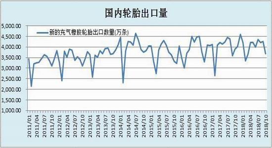 尽管中国对美国橡胶轮胎出口比例持续下降,但是目前美国仍是中国橡胶轮胎的第一出口目的地。数据显示,2017年我国轮胎总出口量为48378万条,其中对美输出轮胎数量为5762万条,占比接近12%。2018年1-9月国内出口美国卡客车轮胎总量上涨26.15%,在一定程度上弥补了出口欧盟国家总量的减少。然而,2018年下半年以来,中美贸易摩擦再度发生,橡胶轮胎产品全面进入美国2000亿美元的征税清单。10月中下旬以来,轮胎厂家为规避美国19年1月份执行加征25%关税的风险,多加大开工负荷,增加对美轮胎出口量,因此轮胎行业开工水平持续维持在相对高位。12月初,G20峰会上中美领导人达成共识,美国暂缓原定于2019年1月1日对价值2000亿美元关税的税率从目前的10%增加至25%的决定,但仍将对2000亿美元的产品保留10%的关税。不过,中美双方将在90天内完成谈判,如果到期无法达成协议的话,中美贸易摩擦的风险后期依然存在。