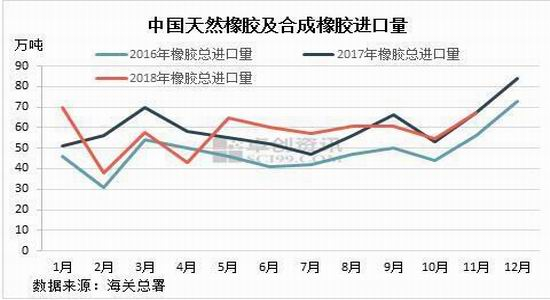 2018年橡胶整体的进口量波动较大,其中以天然橡胶进口波动为主。上半年,受东南亚三国出口限制政策的影响,1-3月份国内进口量呈现明显的下降。但随着泰、印、马三国联合削减橡胶出口政策到期,天然橡胶出口大量增加。根据海关公布的数据,2018年前10个月中国天然橡胶和合成橡胶的累计进口量为511.14万吨,与2017年同期的511.2万吨几乎持平。从主产国生产和出口的季节性来看,四季度国内橡胶进口量将会继续攀升,全年的进口量将和2017年不相上下。