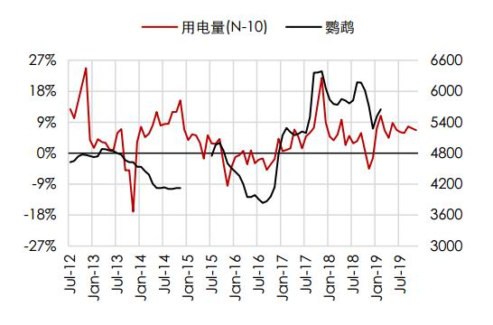 讨论:这是国内用电同比增量(10个月前)与人民币阔叶浆的价格对比图,您认为是否存在相关性?