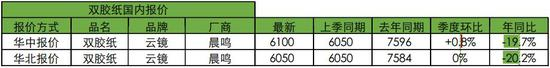 国内规模型生产企业再次发布4月份涨价函,提涨主要集中在200元/吨。目前为止,2019年国内双胶纸企业已经第三次提涨双胶纸价格,可见纸厂目前涨价心态十分迫切,目前终端心态观望。当前100g双胶纸主流品牌经销商报价参考:华夏太阳报价6000-6150元/吨;云镜报价6000-6200元/吨;泉林5600-5800元/吨。