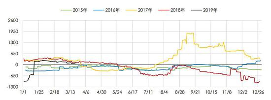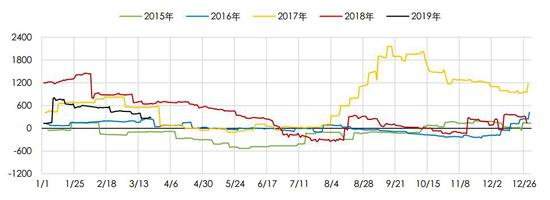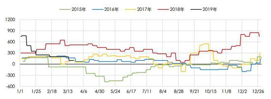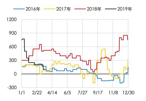 图009 非标品升贴水:本色-针叶季节性折线图(元/吨)