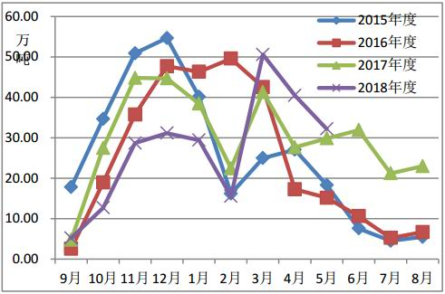 根据公路和铁路数据统计,5月份棉花出疆发运量32.19万吨,环比减少8.27万吨。本年度(2018.9-2019.5)出疆棉公路和铁路共发运了245.92万吨,同比减少了35.44万吨,降幅12.6%。