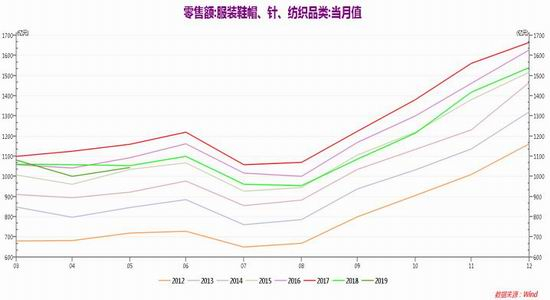 图15:我国服装鞋帽、针、纺织品类零售额(当月值)