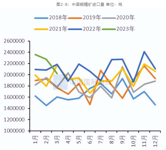 我国精炼铜行业庞大的产能体量带来了巨大的铜精矿需求,但因我国仅拥有全球3.14%的铜矿储量且平均品位较低,铜精矿的对外依存程度在逐年提高,进口铜精矿仍是供应来源的主要渠道。2023年1-3月铜精矿进口量为665.6万吨,累计同比增长4.66%,其中3月铜精矿进口量分别为202.1万吨。一季度受到海外铜矿生产事故的干扰,中国3、4月铜精矿进口会有所下滑。随着近期南美港口运力的逐步恢复,海外矿山扰动的影响削弱。