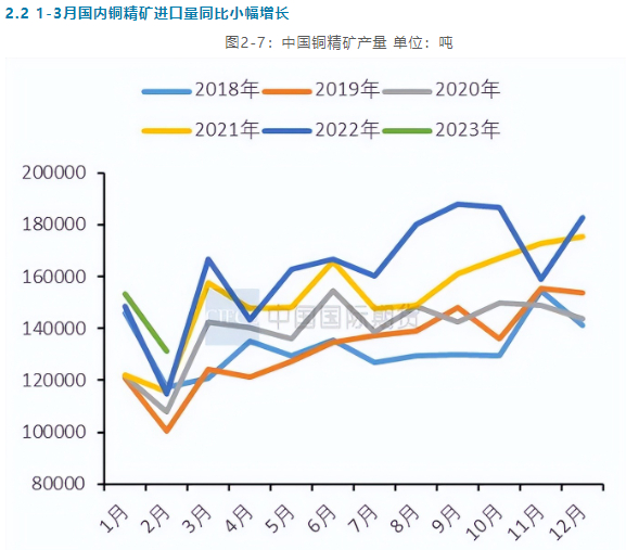 2017年后国内铜矿产量逐年回升,近年来铜精矿产量上升的势头有所放缓。2023年1-2月我国铜精矿产量28.46万吨,累计同比增长2.38%。其中2月我国铜精矿产量13.14万吨,同比增长14.39%。