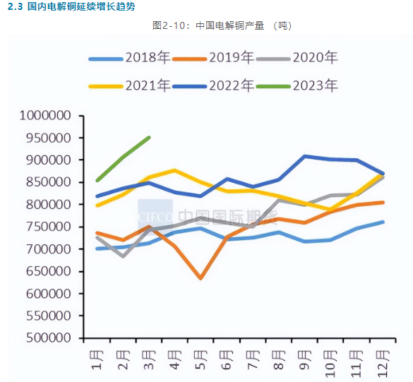步入2023年,冶炼企业迎来新一年的生产计划期。今年一季度在新产能投产和原料相对充裕的背景下,冶炼企业产能利用率较2022年同期提升明显,精铜产量保持了稳定的增速。1-3月电解铜累计产量为271.25万吨,同比增加21.02万吨,增幅为8.4%。其中3月电解铜产量为95.14万吨,环比增加4.36万吨,增幅为4.8%,同比增加12.1%。