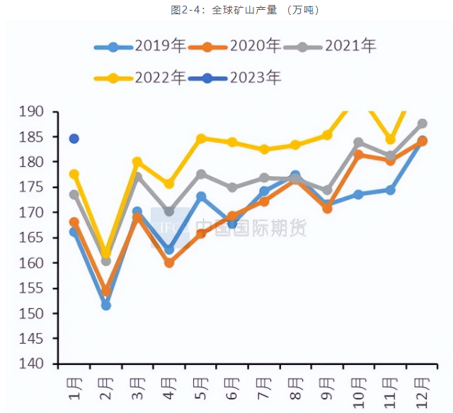 据报告显示,2023年2月全球精炼铜产量为205.55万吨,精炼铜消费量为211.16万吨,供应短缺5.61万吨。国际铜研究组织(ICSG)预计2023年世界铜矿产量将增长3%,2024年预计增长约2.5%。2023年的市场缺口约为11.4万吨,2024年的盈余为29.8万吨。同时高盛将2023年和2024年的LME铜平均价格预期分别上调至9,750美元/吨和12,000美元/吨。