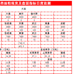 现货方面,国内大豆价格不变。豆粕价格上涨40-170元不等,其中日照上涨170元至3840元/吨,武汉上涨120元至3820元/吨。豆油方面,豆油现货上涨70元,其中青岛上涨70元至7350元/吨,张家港上涨70元至7560元/吨。