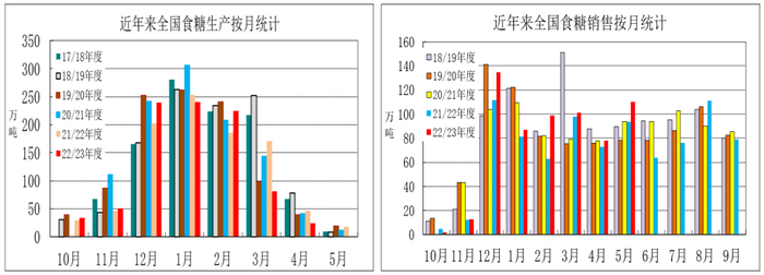 截至2023年5月底,国内糖厂全部停榨,本制糖期累计生产食糖897万吨,同比减产59万吨。累计销售食糖625万吨,同比增加88万吨。剩余工业库存为272万吨,同比减少143.39万吨。前五年6-9月食糖销量平均值约为368万吨,本年度可能存在96万吨供应缺口。