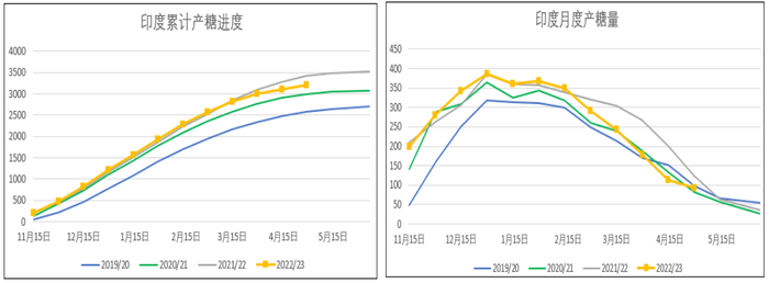 印度:2022/23榨季截至2023年4月底,印度食糖产量达到3203万吨,同比减少220万吨,降幅6.4%。