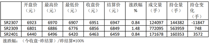 期货市场:郑糖减仓反弹。SR309在6776-6886元之间波动,收盘上涨1.48%。