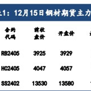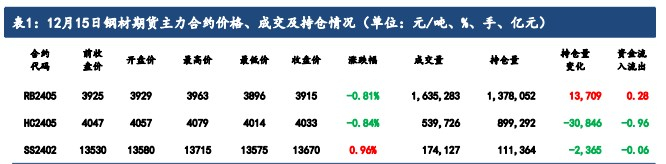 12 月 15 日,螺纹钢、热卷期货主力合约 2405 反弹后再度下滑,分别回吐12月 6 日和 12 月 7 日以来大部分涨幅;不锈钢期货主力合约2402 高开高走,收复12 月 5 日以来全部跌幅。