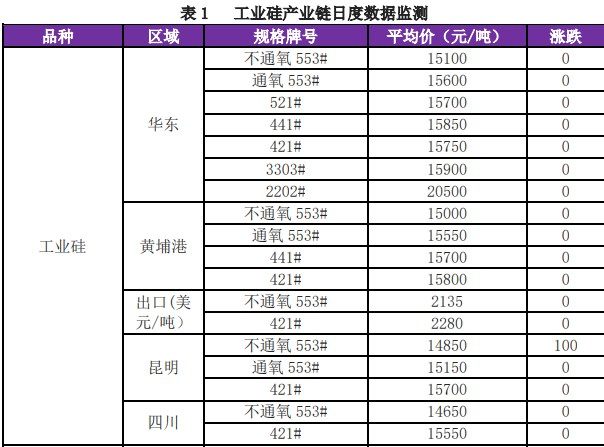 工业硅:现货报价,华东不通氧 553#硅 15100(0)元/吨,通氧 553#硅 15600(0)元/吨,421#硅 15750(0)元/吨。