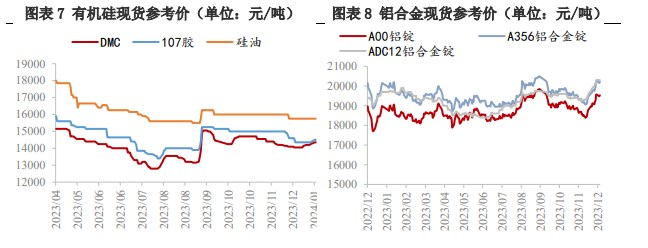 需求端,整体表现乏善可陈。多晶硅方面,硅料价格持续走弱,供应过剩格局逐步显现,但是新产能全面爬坡对工业硅需求维持增量;有机硅方面,DMC 价格窄幅震荡,产量小幅回落,对于工业硅需求以稳为主;铝合金方面开工基本持稳,终端汽车产销数据依旧保持一定增速。