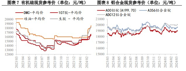 需求中端,多晶硅价格波动较小,有机硅系列 DMC、 107 胶、硅油、生胶报价均有升高。库存方面,本周社会库存共计 36 万吨,环比增加 0.6 吨。