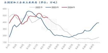 据 Mysteel 农产品调研显示,全国 12 个地区,96 家主要玉米深加工厂家2024 年第23 周(截至6月5日),加工企业玉米库存总量 519.2 万吨,较上周下降 1.48%。