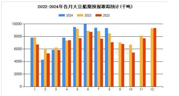 根据中国粮油商务网跟踪统计的数据显示,2024 年 8 月大豆到港量为 930.8 万吨,较上月预报的934.2万吨到港量减少了 3.4 万吨,环比变化为-0.36%;较去年同期 849 万吨的到港船期量增加81.8 万吨,同比变化为9.63%。这样 2024 年 1-8 月的大豆到港预估量为 6375.9 万吨,去年同期累计到港量预估为6259.4 万吨,增加116.5万吨;2023/2024 年度大豆目前累计到港量预估为 8780.7 万吨,上年度同期的到港量为8498 万吨,增加282.7万吨。