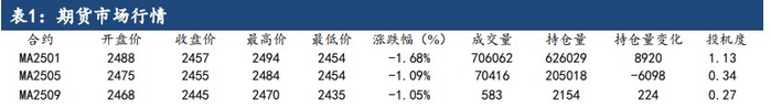今日江苏太仓甲醇现货成交平均价 2475 元/吨,较上一日,下跌35元/吨。近期甲醇基本面矛盾不大,短期走势受宏观整体商品走势,和原油走势,以及上游煤炭价格走势影响较大,根据文华财经数据显示,文华商品指数价格,今日下跌 0.73%;原价指数价格,今日下跌 3.27%;煤炭板块指数价格,今日下跌 1.39%。甲醇期价今日也跟随震荡下跌。短期甲醇价格震荡偏弱看待。