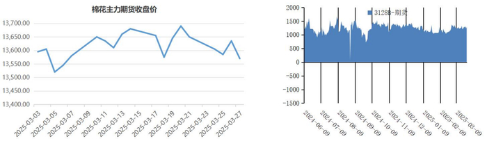 截止3月27日,郑棉期现基差较上月缩小78元/吨,基差较2月有所走弱。