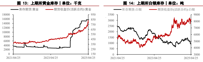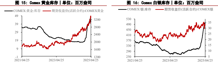 4 月 25 日当周,上期所黄金仓单为 15,648 千克,较此前一周下降 30 千克。白银仓单则是出现 13,623 千克的下降至 923,596 千克。在 Comex 库存方面,本周 Comex 黄金库存下降 1,503,863.55 盎司至 41,705,859.42 盎司,Comex 白银库存则是出现了1,195,298.48 盎司的上涨至 497,908,242.07 盎司。