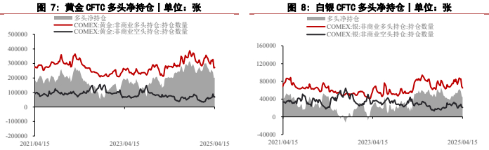 截至 2025 年 4 月 15 日数据(目前最新)黄金 CFTC 多头净持仓较此前一期数据上涨0.74%至 202,210 张合约。而在白银方面净多头持仓为 43,949 张合约,较前一期数据下降 5.52%。