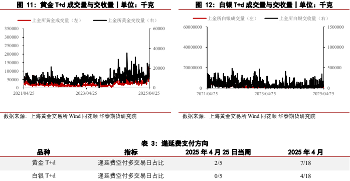 4 月 25 日当周,黄金 T+d 累计成交量为 473,704 千克,较此前一周上涨 75.86%。白银T+d 累计成交量为 3,059,220 千克,较此前一周下降 39.78%。