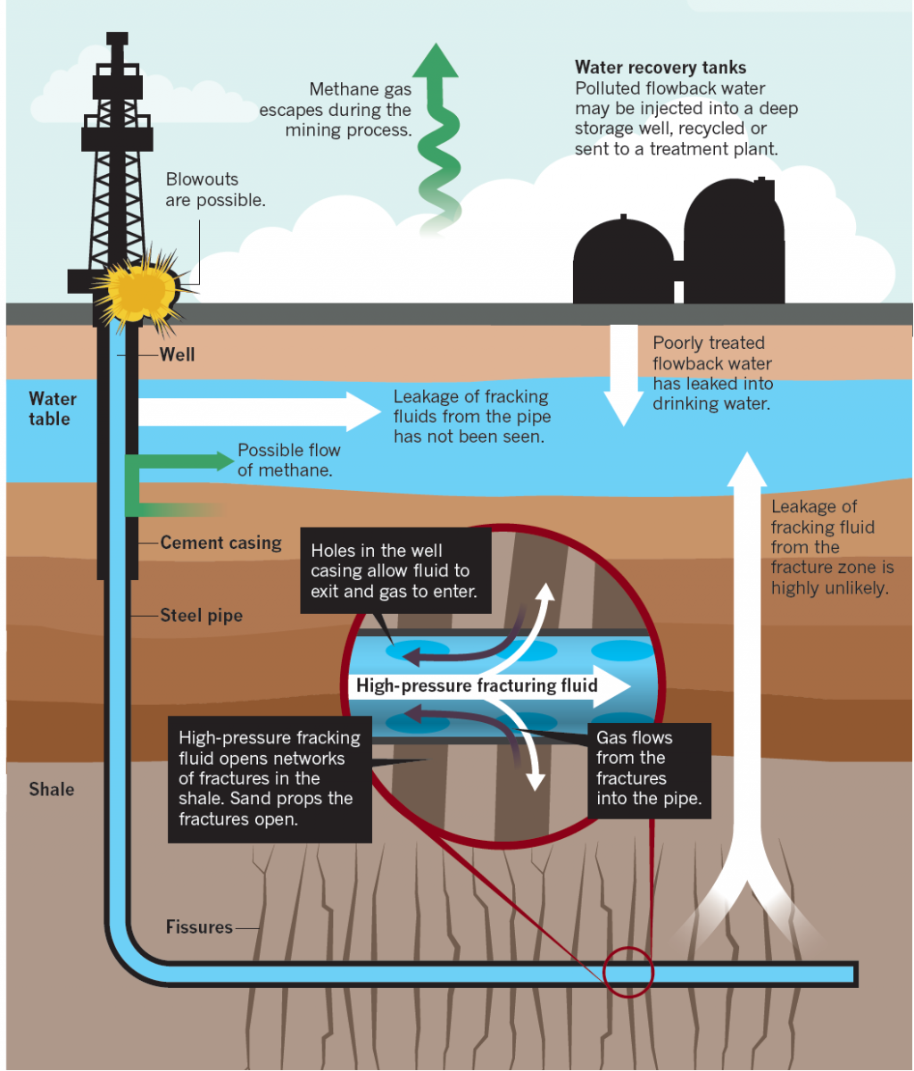 此外,灌输进地层的水中需要添加大量化学物质,因此可能会对地下水造成污染,而出油气的过程还将附带排出有害空气污染物。