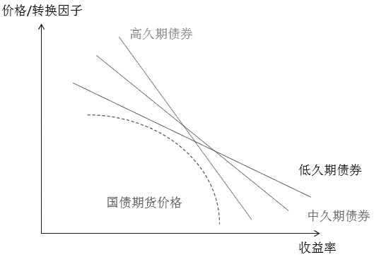 最便宜可交割债券的变化和久期经验法则非常吻合。当收益率下降时,低久期国债将成为最便宜可交割债券,由于对利率的敏感性相对低,低久期国债的价格上涨幅度小于高久期国债。反之,当收益率上升时,高久期国债将成为最便宜可交割债券,由于对利率的敏感性相对高,高久期国债的价格下跌幅度大于高久期国债。