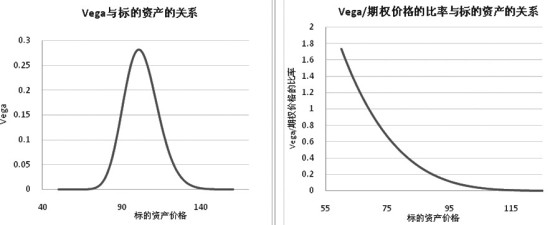 理解了这一点,我们先来看上面两个图。左图描述了行权价为100的看涨期权Vega与其标的资产价格的关系。如图所示,该期权在深度实值和深度虚值时,Vega为零。在平值处,Vega值达到顶峰。右图描述了Vega与该期权价格的比率和对应标的资产价格的关系。Vega与期权价格的比率随着标的资产价格的上涨而降低,并在平值处(100点)接近为零。实值期权处,就变的非常微小。